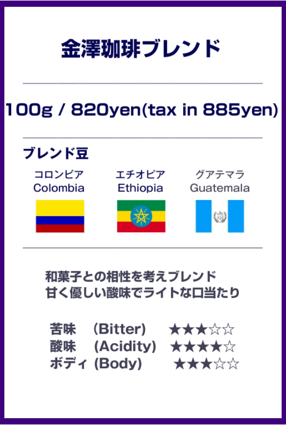 和菓子処であるここ金沢では家庭でも和菓子のお供にコーヒーは一般的です。そんな金沢の和菓子とのマリアージュを考えて作ったコーヒーがこのブレンドです。特にあんことの相性は良く甘くて優しい酸味のコーヒーは繊細な和菓子の美味しさを消すことなく素材を引き出す味わいとなっています。