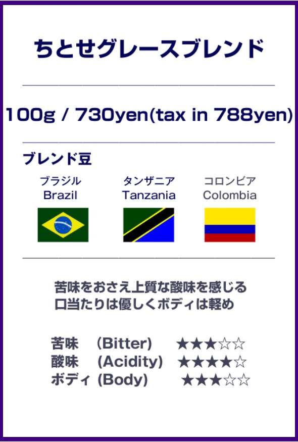焙煎を少し軽めにする事により苦味を抑え上質の酸味を感じるように仕上げたブレンド。